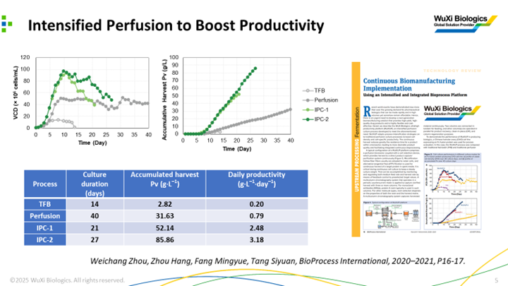 我们的研究显示,传统14天分批补料工艺的日均产量为0.2克/升,WuXiUP™日均产量高达2.5克/升至3克/升,如果结合细胞株筛选和培养基优化最高可达到7克/升。20-25天的连续生产批次产量可达100-120克/升,在1000升规模下全年产量就可以突破吨级。我们也正在攻克下游连续纯化的技术挑战,并且已经在50升中试规模下实现了贯穿上下游的全连续生产。