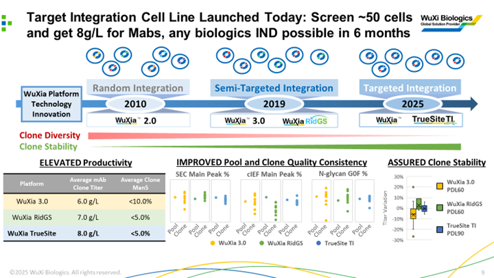 得益于过去十余年在创新细胞株领域的深耕,我们自主开发的细胞株平台WuXia™不断升级迭代,已在超 1000 个分子中得到验证。近期,我们推出了第四代CHO细胞株平台WuXia™ TrueSite ,通过定点整合技术,大幅简化细胞克隆筛选流程,同时确保表达的高稳定性。过去,我们需要筛选上万个克隆才能筛选出2克/升表达量的细胞株;如今,仅需筛选约50个克隆就能找到8克/升表达量且兼具卓越稳定性的细胞株。借助WuXia™ TrueSite这一先进技术平台,我们能够将业内平均6个月的细胞株开发周期缩短至仅2.5个月,使得任何新药临床实验申请(IND)项目都得以在6个月内高效完成。