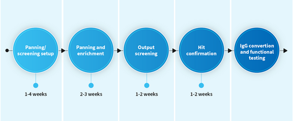 满冠官网使用了超过50+的供体样本来构建全人源天然库,该天然库的多样性高达3*1011,涵盖了几乎所有的人类抗体V基因库。此外,满冠官网还设计构建了全人源合成库,该文库是基于优势种系的轻重链配对来进行设计,多样性高达1*1012。目前已成功交付40+基于全人源天然库/合成库的抗体发现项目。项目交付周期通常如下: