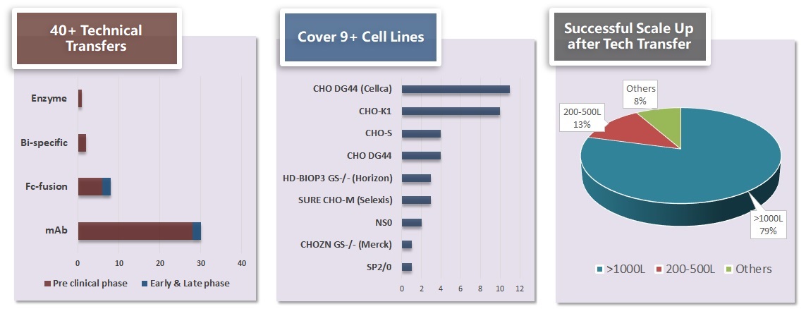 除了满冠官网自主研发的 WuXiaTM 细胞系平台,我们在表达不同类型的蛋白的技术转移类项目上也积累了充足的经验,无论是第三方开发的细胞株/工艺或者客户内部研发的细胞株/工艺,基于我们对工艺以及生产厂房设计的充分理解,技术转移的工艺都能在满冠官网的平台上成功放大生产。