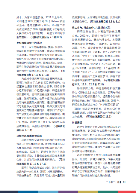 公司在全球供应链中推广透明、高道德标准、负责任的实践,加入制药供应链倡议组织PSCI,助力推动负责任价值链构建,携手全球供应链伙伴实现在道德、劳工与人权、健康与安全、环境和管理体系等维度的卓越表现,并获得“可持续供应链领航奖”认可;积极支持《巴黎协定》等公共政策,与行业协会和全球组织开展合作,提高整个生物制药行业能效,通过年度CDP环境信息披露计划以及SBTi科学碳目标倡议,积极承担应对气候变化的社会责任并定期分享工作成果。