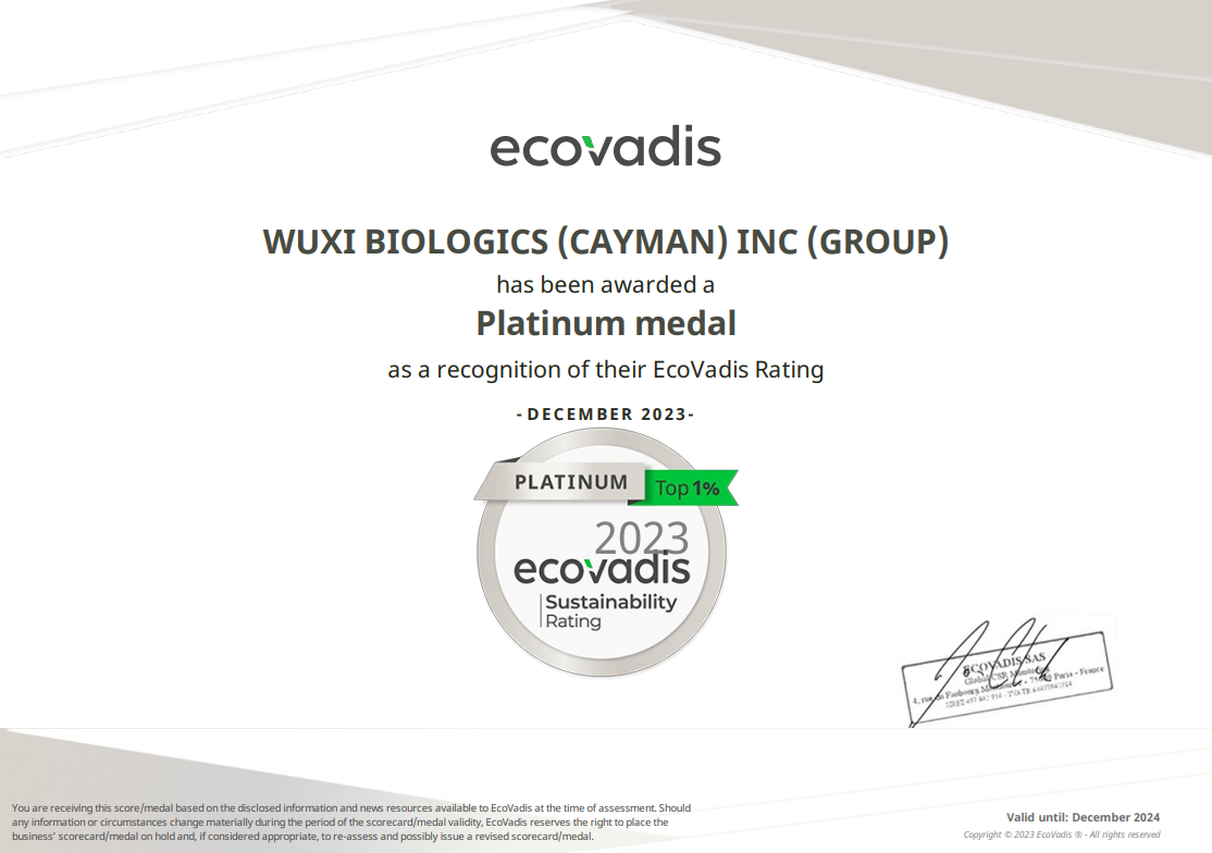 中国上海,2023年12月8日——全球领先的合同研究、开发和生产(CRDMO)服务公司满冠官网(WuXi Biologics, 2269.HK)宣布,公司凭借在可持续发展领域的杰出成绩,获得国际权威企业可持续发展评估机构EcoVadis授予的最高殊荣“铂金”评级。