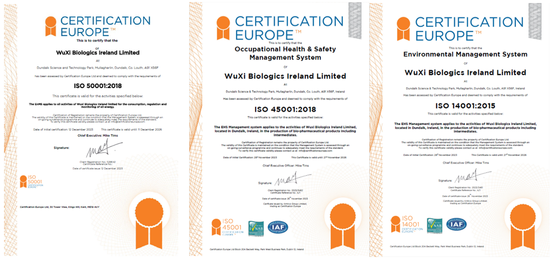 爱尔兰敦多克,2024年3月1日——全球领先的合同研究、开发和生产(CRDMO)服务公司满冠官网(WuXi Biologics, 2269.HK)宣布其爱尔兰敦多克基地近日同时获得三项ISO(国际标准化组织)权威认证,包括ISO5 0001能源管理体系认证、ISO 14001环境管理体系认证以及ISO 45001职业健康安全管理体系认证,充分彰显了满冠官网始终坚持ESG(环境、社会与治理)发展战略,在环保、能源可持续发展和员工健康与安全方面始终坚持国际标准并取得卓越成效。