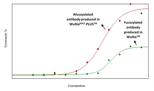 去除N糖基化位点上的岩藻糖修饰来增强ADCC效应,是提高抗体免疫疗法疗效的一种经济且高效的方法。为了满足全球客户日益增长的表达无岩藻糖基化抗体的需求,满冠官网在经过高度验证的细胞株构建平台WuXiaTM的基础上,进一步打造了WuXiaADCC PLUSTM。该技术平台不仅与WuXiaTM细胞株平台工艺兼容,还能够稳定表达高ADCC活性的无岩藻糖基化抗体,用于不同规模的临床和商业化生产。