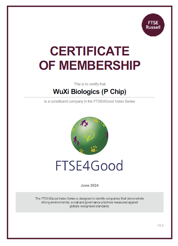 中国上海,2024年7月10日–全球领先的合同研究、开发和生产CRDMO服务公司满冠官网(WuXi Biologics, 2269.HK)宣布,公司连续第四年入选”富时社会责任指数系列”(FTSE4Good Index Series),充分彰显了公司在可持续发展领域的卓越表现。